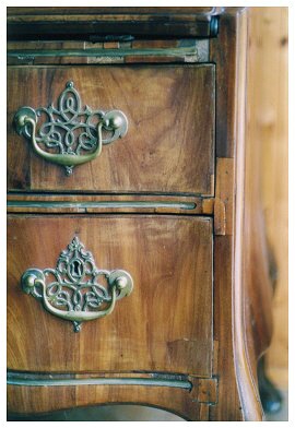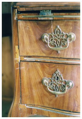 Diese Detailaufnahmen zeigen noch einmal sehr deutlich Fehlstellen und schlechte Ergänzungen. Das linke Messingscharnier wurde repariert. Die Scherenscharniere der Schreibklappe mussten versetzt werden, da der Drehpunkt zum Schließen der Klappe sich verändert hatte.