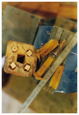 Für das vorhandene Möbelstück bilden jedoch die abschraubbaren Füße einen gewissen Schwachpunkt in der Statik. Der Fuß rechts hinten war schon einmal gebrochen und mit vier Dübeln angeleimt. Diese Reparatur wurde wieder rückgängig gemacht und schraubbar installiert.
